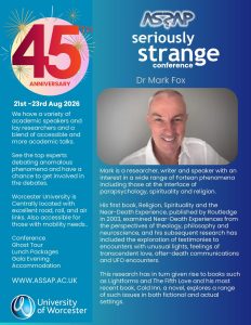 During 2026 I’ll be continuing my ongoing research exploring olfaction as a part of religious, spiritual and extraordinary human experiencing. There has been surprisingly little research on the topic of what these experiences actually smell like so I’m delighted to be treading a still relatively untrodden and unexplored path. I’m also exploring the relatively unexplored topic of UFOs as spiritual experiences – not necessarily positive ones – and I intend that my ongoing research and related publications will reflect this. Back in the spring of 2025 I was delighted to receive a grant from the Association for the Scientific Study of Anomalous Phenomena (ASSAP) to help with aspects of my olfaction research – specifically for an investigation of olfactory elements within UFO close encounters – and there will be more on my Blog page about it in due course. The ASSAP sponsored project – with a working title of Sulphur and Saucers – is due for completion in April this year and there will be an accompanying webinar via ASSAP around that time also.